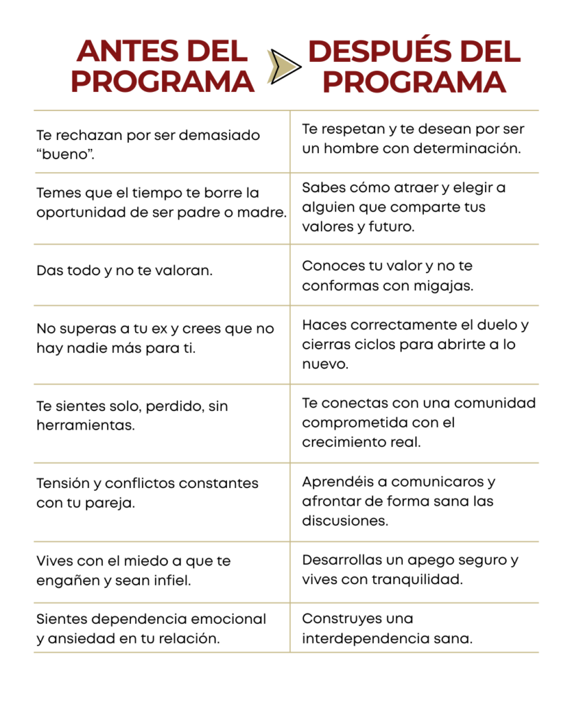 Si eres de los que cree en el amor duradero y la familia, nuestro programa Despertar Masculino y Femenino es para ti. Nuestros alumnos trabajan en todas las áreas imprescindibles para convertirse en el tipo de persona que está llamado a ser y que es capaz de atraer y mantener a la persona correcta.